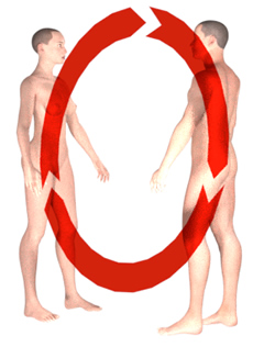 Das Grundprinzip eines solchen Energiekreises ist es also den natürlichen Energiestrom in der Frau nach oben und den Grundenergiestrom im Mann nach unten miteinander zu verbinden und dass sich also so ein Energiekreis bildet: Im Mann nach unten ==> dann zu der Frau ==> dann in der Frau nach oben ==> dann wieder zum Mann ==> dann wieder im Mann nach unten, usw usw. So bildet sich dieser Energiekreis, der sich dann im Idealfall immer weiter verstärkt, sich energetisch immer mehr in die Höhe schraubt, der dadurch auch immer mehr Gestautes in den beiden mitreißt, ins Fließen bringt, und so auch immer mehr Heilungsprozesse anregt, usw.